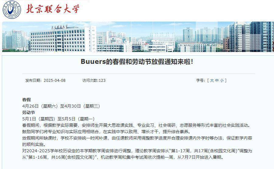 北京联合大学校办工作人员向极目新闻记者证实,春假和清明节连放9天假的通知是17日下午在校内OA办公系统发布的。据了解,2025年该校春假是和劳动节连在一起的,从4月26日至30日为5天春假,5月1日-5日为五一假期,共计10天。